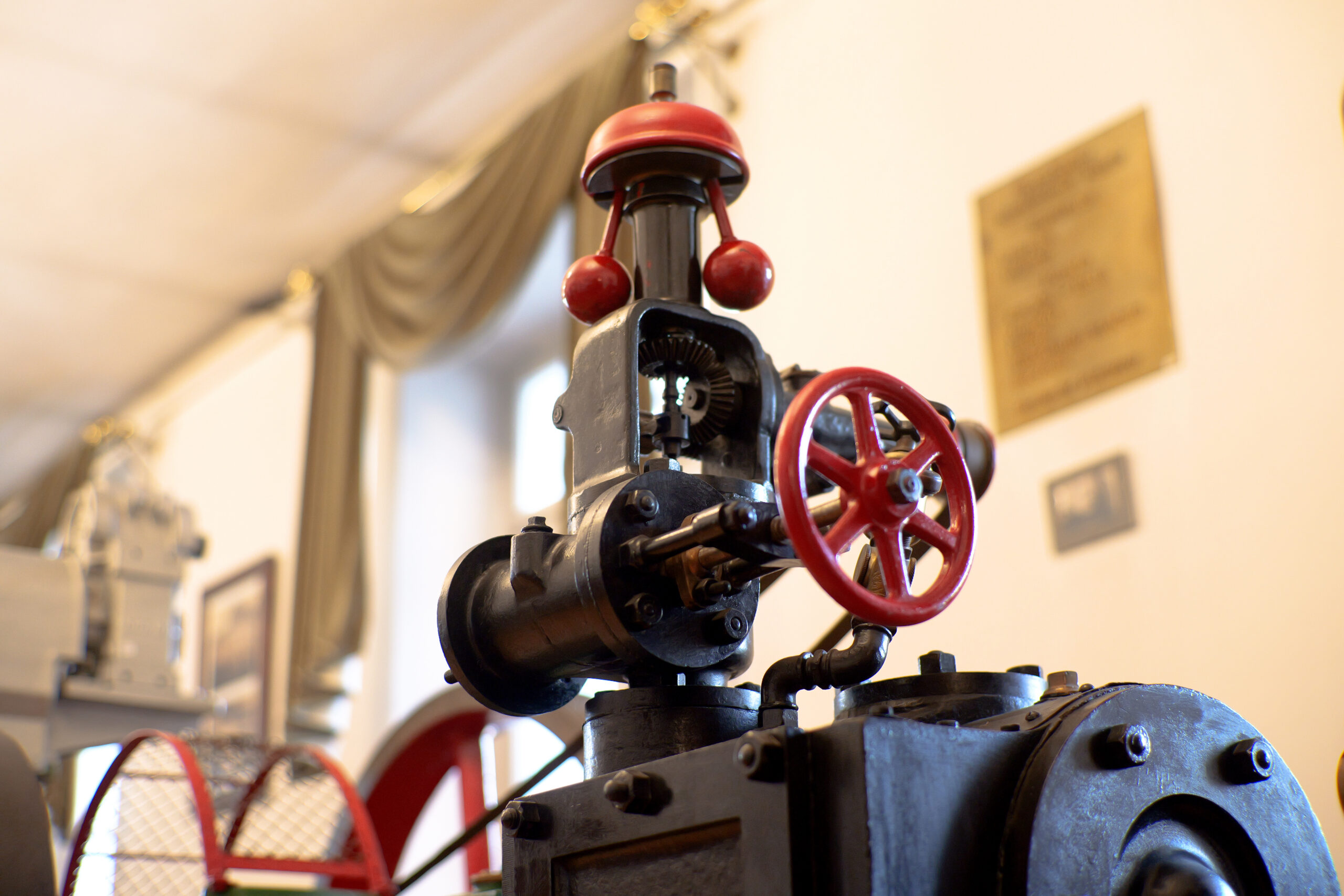 W holu muzeum znajduje się maszyna parowa w układzie pionowym, która służyła do poruszania wszystkich urządzeń gorzelni.